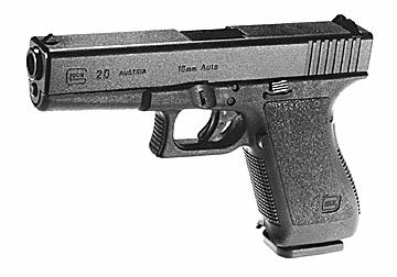 A slightly larger version of the Glock 17, this gun fires the powerful 10 mm