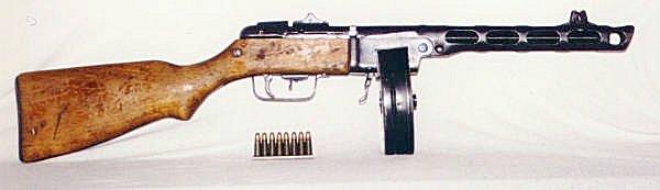 The PPSh is a rugged Soviet submachinegun designed from experience in the Winter War against the Finns. Using the small but powerful 7.62X25 pistol round (interchangable with 7.63 Mauser) found in the Tokarev, it can accomodate a proven 71 round drum.